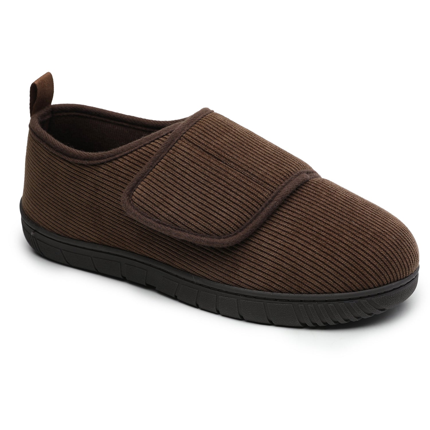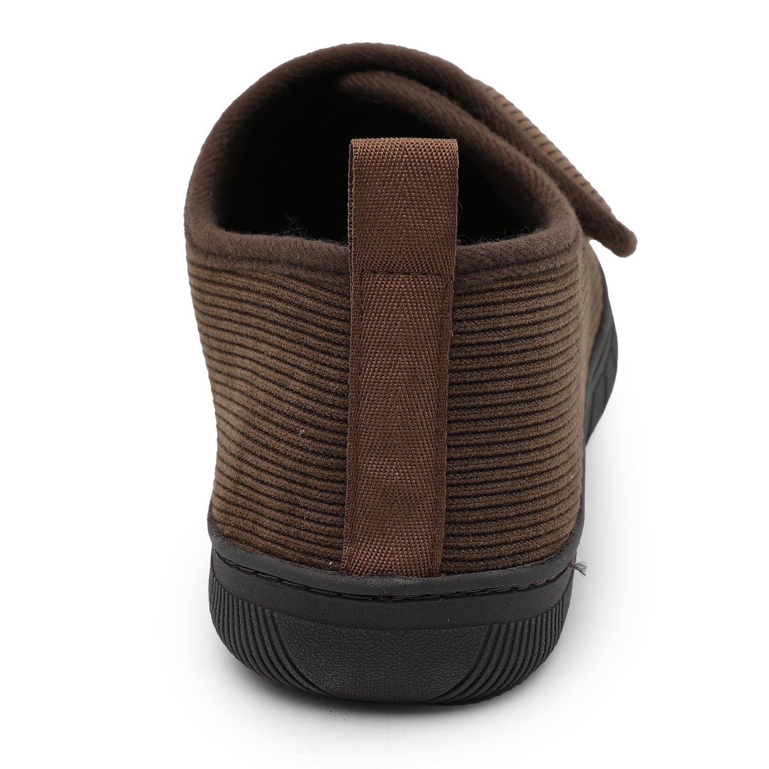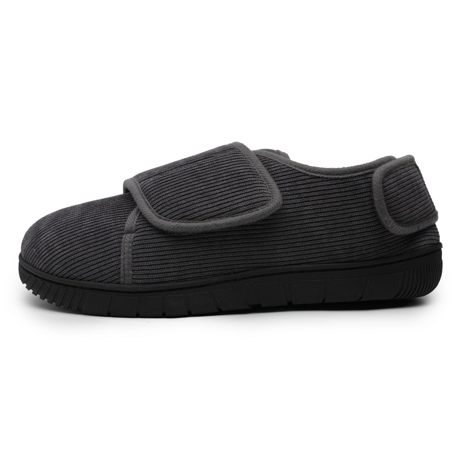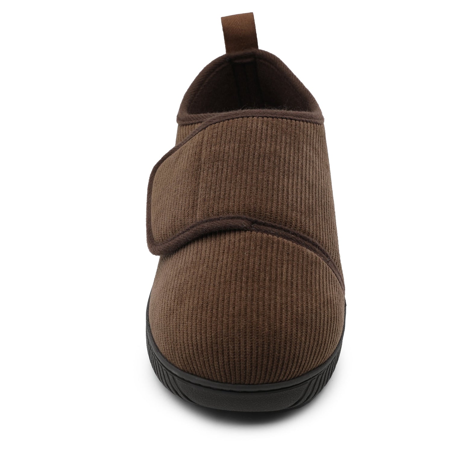 Soft velvet / corduroy cloth upper plus cozy fuzzy coral fleece lining, with flap closure for adjustable comfort perfect for tired, swollen feet and better stability. Easy slip-on, full coverage style with comfortable hook-and-loop strap for customized fit that hugs your feet.
