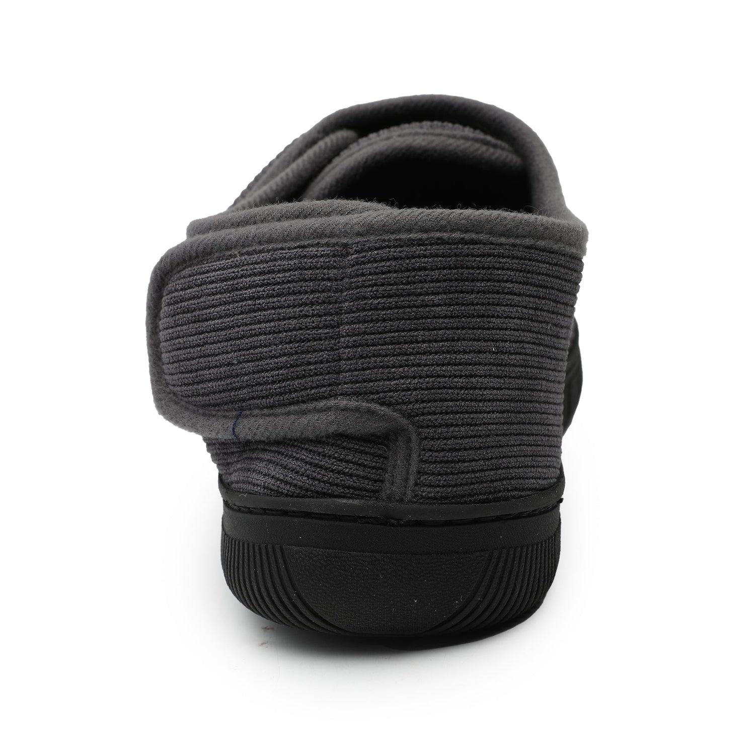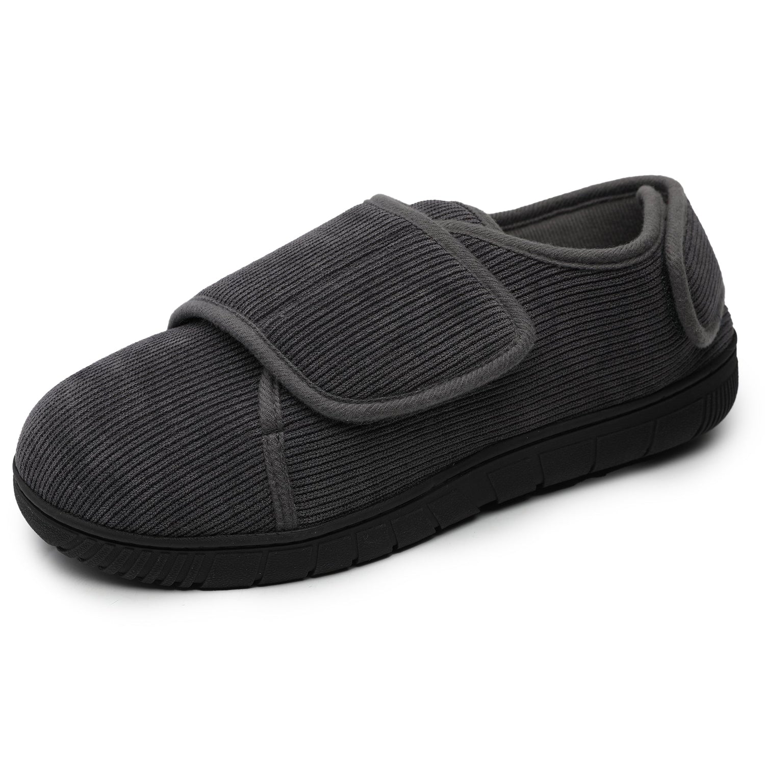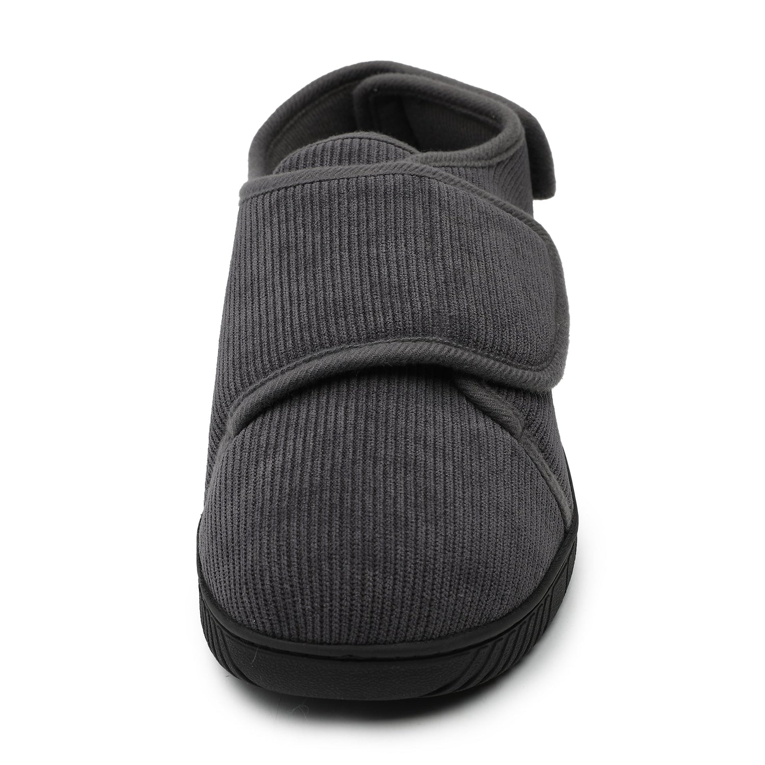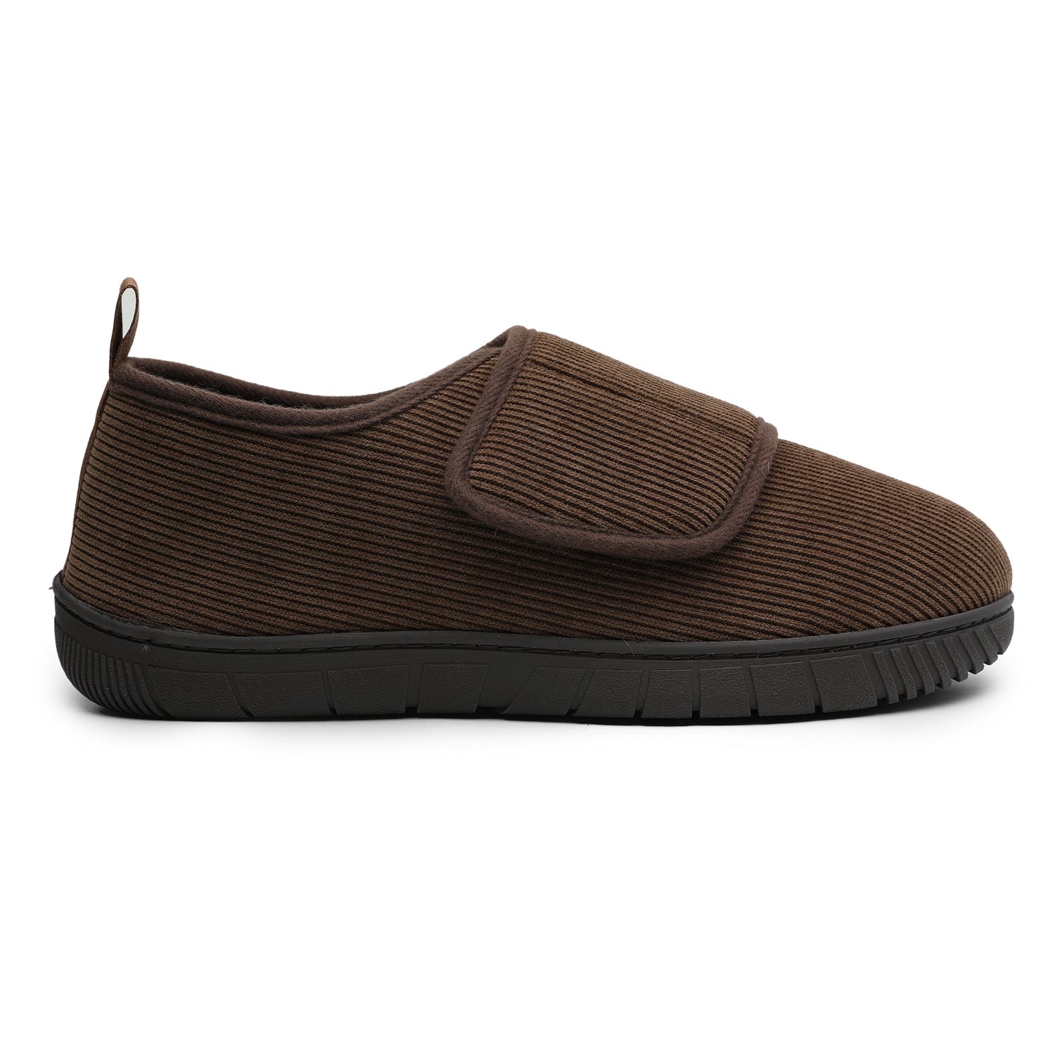 Soft velvet / corduroy cloth upper plus cozy fuzzy coral fleece lining, with flap closure for adjustable comfort perfect for tired, swollen feet and better stability. Easy slip-on, full coverage style with comfortable hook-and-loop strap for customized fit that hugs your feet.